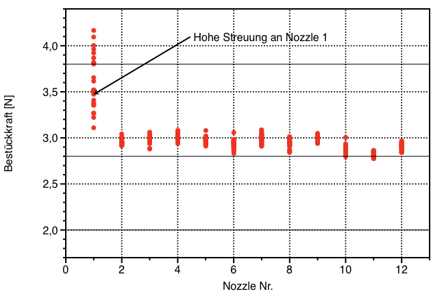 Dieses Beispiel zeigt deutliche Abweichung der Nozzle 1. Diese Erkenntnis ermöglicht eine gezielte Fehlerbehebung.