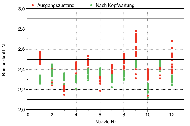 Die Ergebnisse zeigen Unterschiede vor und nach der Kopfwartung. Nach der Wartung (grün) haben sich Standardabweichung und Mittelwerte verbessert.